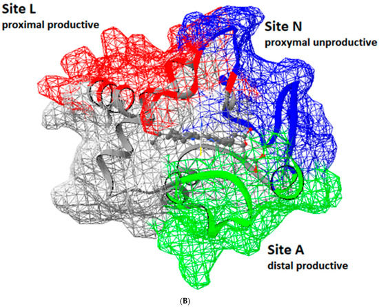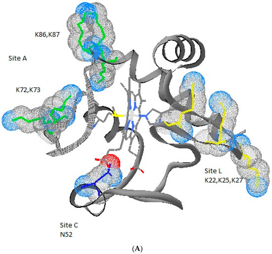 Space-filling model showing the binding sites for CL hypothesized to be present in cyt c (1HRC.pdb) (A): Site A and site C, as proposed by Kinnunen and collaborators [46,47]; site L, as proposed in [53]. (B): binding sites for CL as hypothesized in ref. [55]. The site L (red) and site A (green), are, respectively, the proximal and distal sites that give rise to the ‘productive’ binding with CL; the site N (blue), is the site that gives rise to the ‘unproductive’ binding with CL. These sites closely resemble site A and site C as previously reported by others (Figure 2A); however, a large number of residues (approx. 20) involved in the formation of each of the three sites were identified in this study. For more details, see the text. The protein structure was visualized with the Swiss-Pdb Viewer software (http://www.expasy.org/spdbv/ accessed date 12 March 2022).