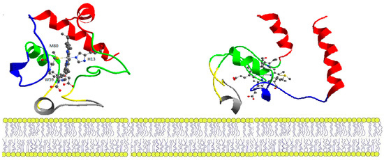 Schematic representation of the binding mode of cyt c (1HRC.pdb) to CL as a function of the protein/phospholipid molar ratio. Left: the ‘compact’ conformation maintained by the CL-bound protein at 1:6 cyt c/CL molar ratio. Right: the ‘extended’ conformations acquired by CL-bound cyt c at 1:250 cyt c/CL molar ratio, as hypothesized in [61]. For more details, see the text. The protein structure was visualized with the Swiss-Pdb Viewer software (http://www.expasy.org/spdbv/ accessed date 12 March 2022).
