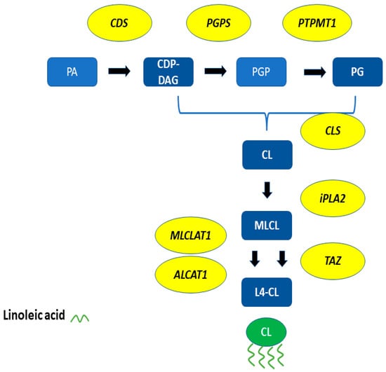 Indeed, several steps of modifications of phosphatidic acid (PA) within the mitochondrion, where CL is uniquely utilized, characterize the CL biosynthetic pathway. From yeast to upper eukaryotes, CL biosynthesis in mitochondria are typical highly conserved and well-characterized steps [69,70,71,72,73]. The conversion of mitochondrial phosphatidic acid (PA) into cytidine diphosphodiacylglycerol (CDP-DAG) by the mitochondrial CDP-DAG synthase (CDS) is the first reaction of CL biosynthesis. Phosphatidylglycerolphosphate synthase (PGPS) catalyzes the transfer of the phosphatidyl group from CDP-DAG to glycerol-3 phosphate and generates phosphatidylglycerol phosphate (PGP). PGP phosphatase codified by PTPMT in mammals catalyzes the subsequent dephosphorylation of PGP to phosphatidylglycerol (PG). Next, CL synthase (CLS) catalyzes the final reaction of “de novo” CL synthesis by adding a phosphatidyl group from CDP-DAG to PG [69,70,71,72,73].