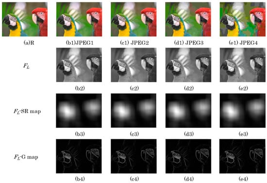 where RL and DL are the luminance channels of the reference and the distorted images, respectively. α represents the fusion weight and FL is the fusion map. In Figure 1, some example images are selected from the TID2008 database to illustrate the validity of FL maps. Figure 1a is a reference image R and Figure 1(b1–e1) are four JPEG compression images with distortion levels increasing, while Figure 1(b2–e2) represent the FL maps among the images in the first row. It can be clearly seen that the quality of the FL map is lower when the distortion level is higher. In FL maps, some weaker edges in the background region are smoothed, especially in Figure 1(e2). Figure 1(b3–e3) represent the SR maps of the images in the second row after normalization, and Figure 1(b4–e4) are the gradient maps of the images in the second row. It can be observed that there are no obvious differences among the SR maps, whereas the gradient map presents more structural features losing as the image becomes more distorted. As we all know, the SR map indicates the visual attention of an image, and the gradient map can represent the edge features well. After luminance channels fusion, the stronger edges in the texture region will not change obviously and some information in the flat region can be changed. So, the changes in visual saliency features in the SR map cannot be figured out easily and the flat region in the gradient maps may exhibit apparent differences. In the next subsection, the differences in SR maps will be shown by similarity maps calculation.