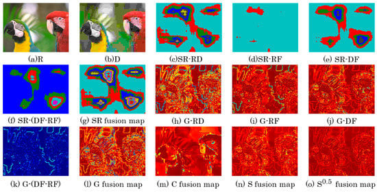 In Equation (14), the three components of the features fusion map have different weight settings in an S map computing procedure. These values are determined by the visual mechanism, since the HVS is generally more sensitive to achromatic features than to chromatic features [30]. The sum of the weight value should be set as 1 and the weight value of achromatic features can be twice as high as chromatic features. Since the SR and gradient features are all achromatic features, extracted in the luminance channel, the weight values of these two features should be set the same. Thus, the weight values of the three parts are set in Equation (14). Figure 2n is the features fusion map. After the three similarity fusion maps are connected, the features fusion map can represent the difference between R and D well.