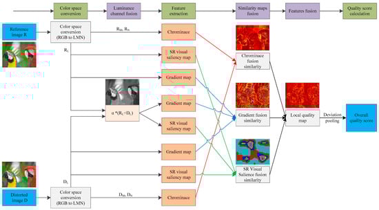 The second fusion step is similarity maps fusion. In this subsection, SR, gradient, and chrominance similarity fusion maps are computed in a symmetric way for the reference and distorted images. To extract visual saliency features, the SR operator is selected to process the input images. The prominent advantage of this index is its higher computing efficiency. Different from other SR-based IQA methods [20,24], the fusion similarity map of SR will be calculated with the following equations: