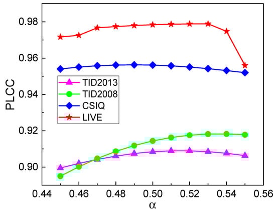 Parameter α serves as the fusion weight between the luminance channels of reference and distorted images. As shown in Figure 4, PLCC changes with α on the four single-distortion databases presented. The optimal intervals for α on TID2013, TID2008, CSIQ, and LIVE are in [0.5, 0.53], [0.51, 0.55], [0.47, 0.52], [0.5, 0.53]. It can be found that the best fusion weight values are different for each database. In these databases, the optimal α values have similar intervals, which is consistent with visual perception under certain fusion weights in IQA. In this research, α is fixed as 0.52.