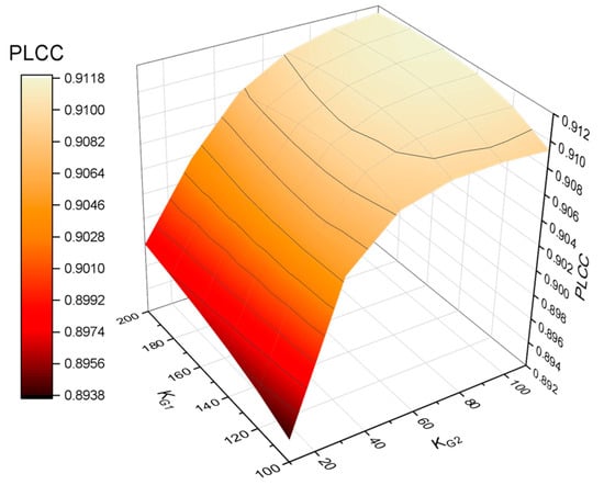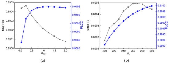 In this work, there are five main parameters that need to be determined, including α, KSR1, KC, KG1, and KG2. In the optimizing procedure, when a parameter is tested, the others are fixed as invariable. PLCC is selected as the main criterion to define the parameters because these four criteria perform similarly in parameter optimization experiments.
