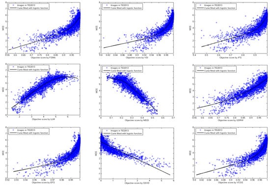 Scatter plots of subjective MOSs against scores calculated on the basis of the compared methods’ predictions for TID2013 databases.