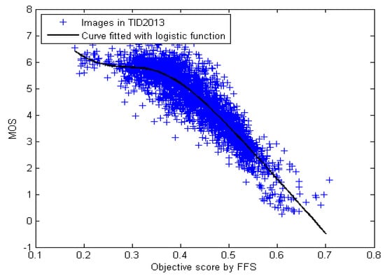 Scatter plot of subjective MOSs against scores calculated on the basis of the proposed method’s predictions for TID2013 databases.