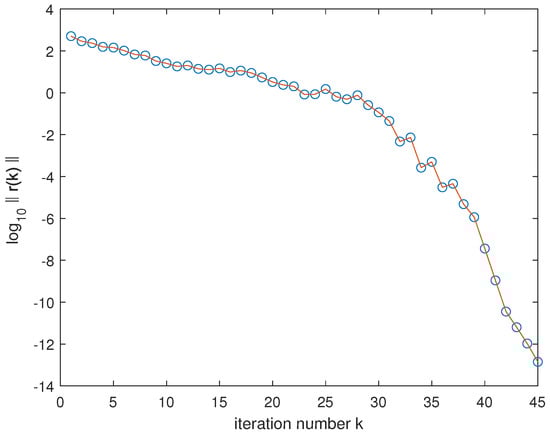 For the initial matrices we obtain a solution group after 858 steps, with . Figure 3 displays the convergence curve for The results show that Algorithm 1 is quite efficient.