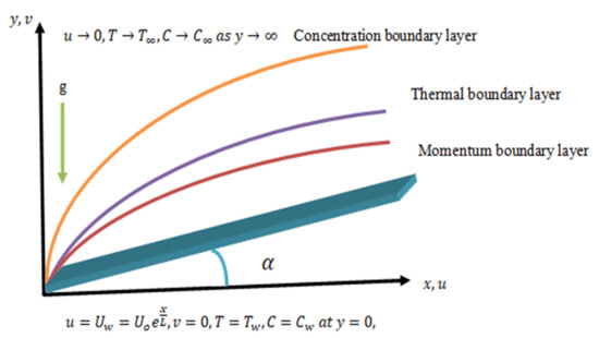 - The axes are horizontal and normal at the surface of an exponentially inclined stretching sheet. The schematic diagram to show the flow coordinate system and boundary layer is given in Figure 1.