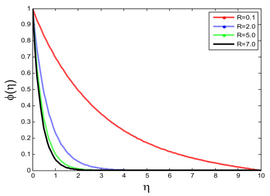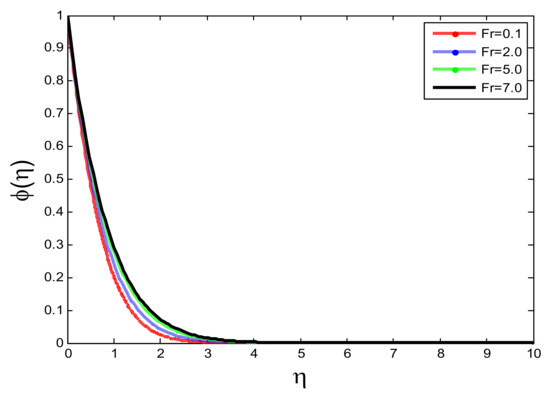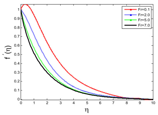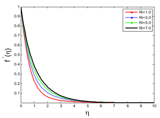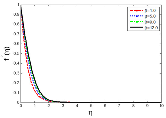 The proposed mechanism was converted into the mathematical model given in Equations (1)–(4), along with the boundary conditions (5). This system of partial differential equations was reduced to a system of ordinary differential equations by using the similarity variable formulation given in Equation (6). The reduced form of ordinary differential equations was converted to a system of first-order differential equations. The first-order ordinary differential equations were solved numerically in the MATLAB built-in numerical solver bv4c. The numerical results of the velocity profile , the temperature profile , and mass concentration , along with the skin friction coefficient , the rate of heat transfer , and the rate of mass transfer were computed. The parameters against which the numerical solutions of the physical properties were named as the Richardson number , the buoyancy ratio parameter , the viscoelastic parameter , the cross-viscous parameter , the third-grade fluid parameter , the permeability parameter , the local inertial coefficient , the magnetic field parameter , the Prandtl number Pr, the Schmidt number Sc, and the chemical reaction parameter . All the numerical solutions were calculated at an angle of inclination of a stretching surface from the -axis. The appropriate ranges of the parameters were taken as ; ; ; and . The values of , the numerical infinity values, were kept large enough and were retained at . Actually, this value is dependent on the physical parameters of the phenomenon, and its value was adequate to simulate for all cases presented in Figure 2, Figure 3, Figure 4, Figure 5, Figure 6, Figure 7, Figure 8, Figure 9, Figure 10, Figure 11, Figure 12, Figure 13, Figure 14, Figure 15, Figure 16, Figure 17, Figure 18, Figure 19, Figure 20 and Figure 21 for the graphical representation of the velocity profile , the temperature profile , and mass concentration . The numerical results for the skin friction coefficient , the rate of heat transfer , and the rate of mass transfer were computed exactly at the surface of the geometry. The current numerical results were compared with existing results for special cases for the validation of the current study.