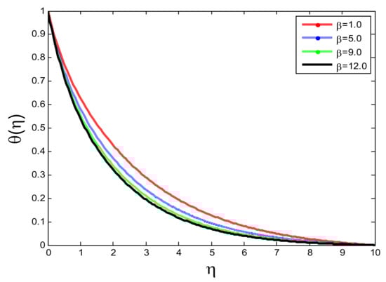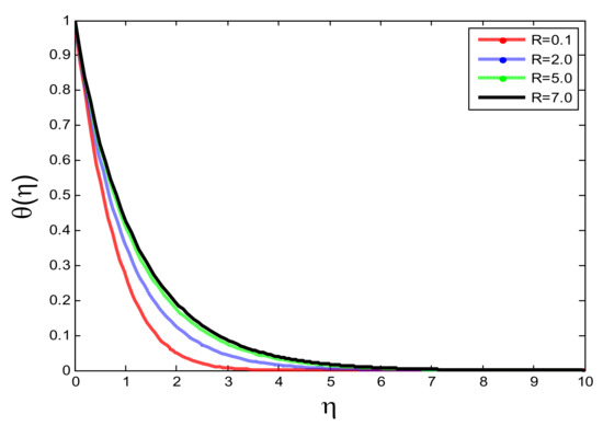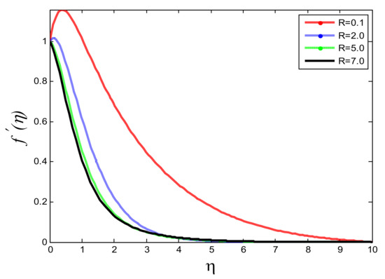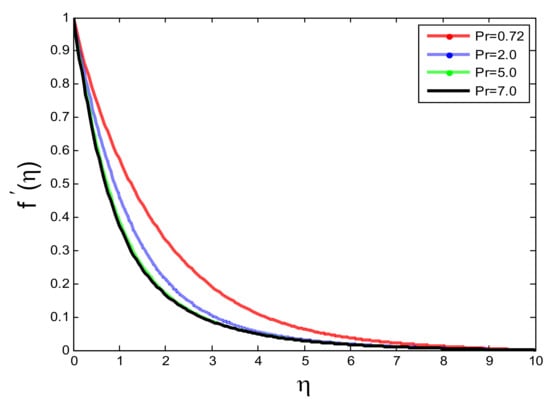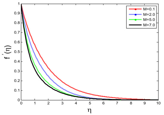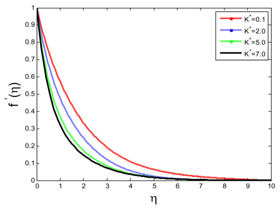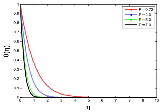 By using the above-mentioned similarity variables given in Equation (6), Equation (1) is satisfied automatically, and Equations (2)–(4) with boundary conditions from Equation (5) adopt the following form: