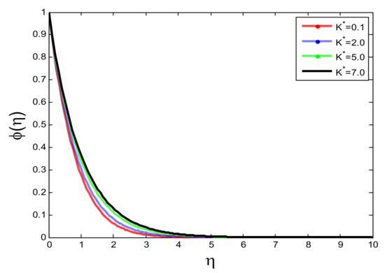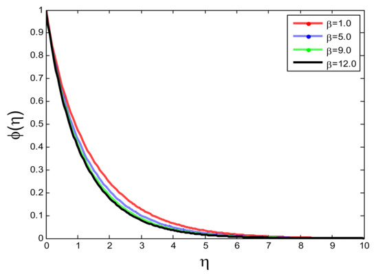 The physical significance of the Richardson number , also known as the mixed convection parameter, on velocity , temperature field , and mass concentration is shown in Figure 2, Figure 3 and Figure 4. From the graphical presentation of the results, it can be inferred that, owing to an enhanced , the property grows as well, but the temperature and concentration fields decline in a visible manner. The impact of the third-grade fluid parameter on , and is illustrated in Figure 5, Figure 6 and Figure 7. It is concluded that, against the increasing value of , an intensification in the velocity of the fluid and an attenuation in the temperature and concentration profiles are seen. By increasing , the reference velocity is increased, and the viscosity is decreased, which causes the reduction in fluid velocity. The physical significance of the Lorentz force parameter, also termed as the magnetic field parameter or Hartmann number , on , and is displayed in Figure 8, Figure 9 and Figure 10. From the graphical demonstration of the results, it is noted that, by increasing , the velocity of the fluid reduces, but the temperature and concentration profiles are expanded. From a physical point of view, this phenomenon is true because, when is enhanced, Lorentz force is basically strengthened, which retards the movement of the fluid, causing a decrease in the velocity. By increasing the value of , resistance within the fluid flow domain is generated, which causes the temperature to rise. The effect of the permeable parameter on the velocity, temperature, and concentration profiles is presented in Figure 11, Figure 12 and Figure 13. The graphs highlight that decreases, but and increase. Physically, this is true because, when is enlarged, the viscosity is augmented, and the porosity of the porous medium is decreased, due to which the velocity is slowed down. The , and are plotted against the local inertial coefficient in Figure 14, Figure 15 and Figure 16. The results show that falls, but and grow. This happens, physically, because an increase in basically causes an increment in the drag coefficient and a decrement in the porosity of the porous medium, which compels the fluid velocity to decrease. The data plotted in Figure 17 and Figure 18 reveal the physical impact of on the considered unknown quantities. The sketches show that, by strengthening , the velocity and temperature of the fluid fall. From a physical point of view, the occurring phenomenon is true because, as increases, the viscous force is enhanced, and the thermal conductance of the fluid drops, causing are duction in the velocity and temperature; the opposite scenario is observed in the concentration profile. By increasing the values of , the velocity boundary thickness and thermal boundary layer thickness gradually decrease. The Figure 19, Figure 20 and Figure 21 illustrate the impact of the chemical reaction parameter on the velocity profile, the temperature field, and mass concentration when the rest of the parameters are kept constant. It is seen that, as is augmented, a reduction occurs in . The graphs show that, as is increased, the velocity decreases, the temperature increases, and mass concentration is decreased. The increase in temperature and the decrease in mass concentration are due to heat generated from the chemical reaction occurring in the fluid flow domain. All the graphs are plotted at theangle (inclined exponentially stretching plate), and asymptotic behavior is observed in all the graphs satisfying the molded conditions.