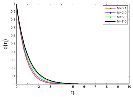 From a technological standpoint, magnetohydrodynamic flows in experimental and theoretical research are essential because they have various applications, such as magnetohydrodynamic electrical power generation, geophysics, and so on. There is much physical significance of the magnetic field in the study of the heat transportation process; the idea of the magnetic field in the boundary layer flow has attracted a great deal of attention from researchers. Therefore, an enormous amount the research focusing on the impact of the magnetic field on the different fluid characteristics, along with several geometries with different flow conditions, has been encountered. The magnetohydrodynamic Casson fluid flow over a stretching cylinder was analyzed by Tamoor et al. [37]. The influence of the magnetic field and a chemical reaction on convective heat and mass transfer over an exponentially stretching sheet was studied by Pattnaik et al. [38]. Magnetohydrodynamic flow with thermal radiation effects over an exponentially stretching sheet was tackled numerically by using the Homotopy Analysis Method in [39]. Salahuddin et al. [40] documented the research study of the topic of Williamson fluid flow via the generalized heat transportation law over the stretching sheet with a variable thickness in the presence of the magnetic field. Kumar et al. [41] explored the process of magnetohydrodynamic flow past a cone and wedge with a variable heat source and sink. The effects of the magnetic field of the fluid flow and heat transfer with different flow conditions and fluid characteristics on the diverse flow geometries are discussed in [42,43,44,45,46].