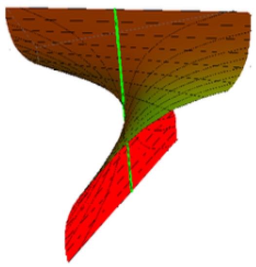 where h, ψ and are constants. These constants can control the shape of . Take and , for example. The timelike helicoidal surface is shown in Figure 2, where and .