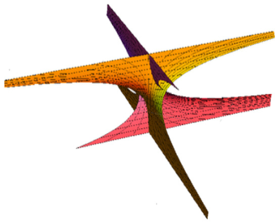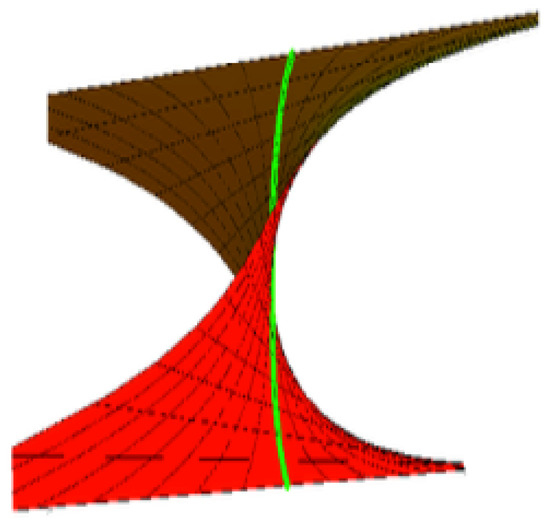 where h, ϑ and are constants. Take and , for example. The timelike Bertrand offset is shown in Figure 3, where and . The graph of the timelike ruled surface with its Bertrand offset is shown in Figure 4.