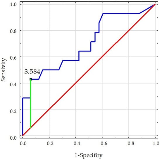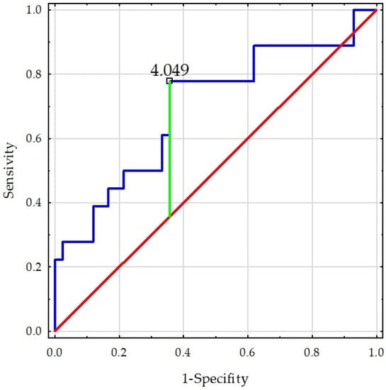 The next analysis step included the cut-off point for significantly different factors for both sexes. For men, the relative peak force–SI cut-off point was established at 4.049 (Figure 1), whereas for women, in terms of LL, the skeletal muscle mass–SI cut-off point was 3.584 (Figure 2). Subjects with higher results of the appropriate index are more likely to be injured.