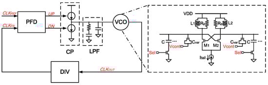 The source of VCO phase noise is electronic noise, power supply noise, and substrate noise; the phase noise directly determines the quality of the clock signal generated by the PLL []. The phase noise of the LC VCO can be expressed in Equation (1) []: