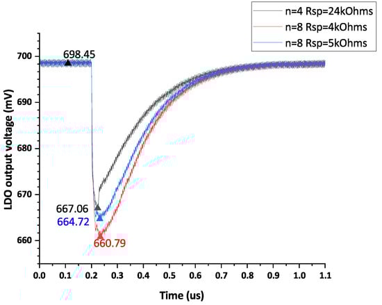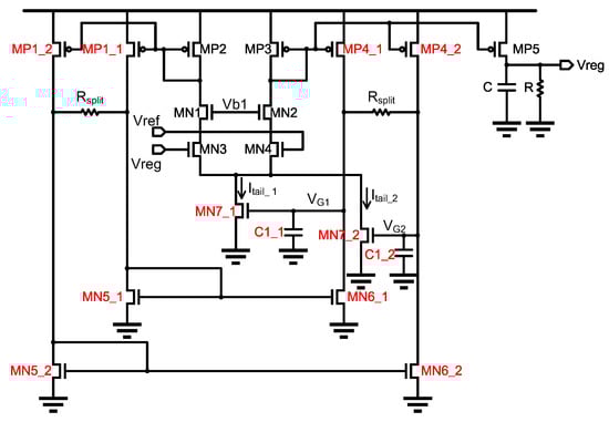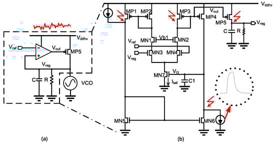 Figure 2b shows the implementation of the LDO circuit in this paper. A start-up circuit is not presented in the schematic. Double exponential current sources with a peak value of 2 mA and a decay time of 2 ns are injected at the drains of , , , and , respectively.