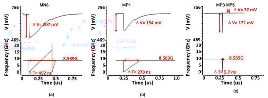 Figure 3b,c present the transient simulation of the LDO output voltage and VCO oscillation frequency when the particle strike occurs on the , and . The LDO output voltage changed from 700 mV to 546 mV, 529 mV, and 732 mV, respectively. The oscillation recovery times were 278 ns and ns for and .