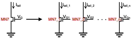 The equations indicate that the voltage fluctuation is related to the value of the resistance . Furthermore, the more splits there are in SMPS, the smaller the corresponding bias voltage fluctuation of will be. Hence, the tail current change caused by the voltage fluctuation will be reduced and the total change in the current induced by SET will be smaller.