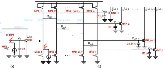 To make the split parts independent of each other, all the splits are provided by independent bias circuits. When splitting , it is necessary to split , , , and , respectively, into the same number of parts as . To further attenuate the effect of the SET on the current, resistive decoupling is adopted in this design. The splits of the same node are connected by a resistor in the middle. The current is supplied in the multi-path, and transistors are symmetrically split. The overall hardened circuit symmetrical multi-path splitting (SMPS) when transistors are split into two parts is shown in Figure 5.