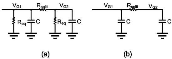 As mentioned above, the number of splits n must be a power of two. When , the bias voltage of is provided by , and the bias voltage of is provided by . When the drain of is affected by a single particle, the voltage fluctuation occurs, and this voltage fluctuation will change the current of . To analyze the propagation of this fluctuation in the circuit, we give the equivalent circuit of SMPS, as shown in Figure 7a.