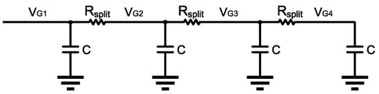 If we split the circuit into four parts (when split factor ), the voltage fluctuation of each stage is gradually reduced. Figure 8 shows the equivalent circuit when .