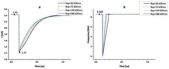 SET-induced disturbance in (a) total current sum of and ; (b) VCO oscillation frequency with SMPS circuit when the split factor is 2.