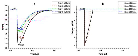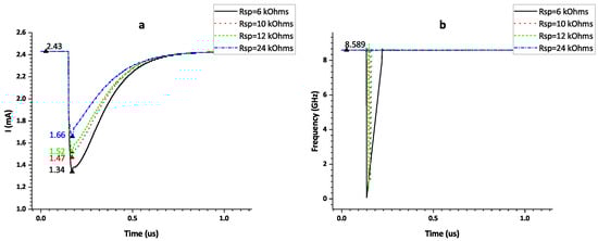 To evaluate the impact of these current pulses, the output voltage of the regulator , and the frequency of the VCO were analyzed. The simulation results are shown in Figure 3a–c.