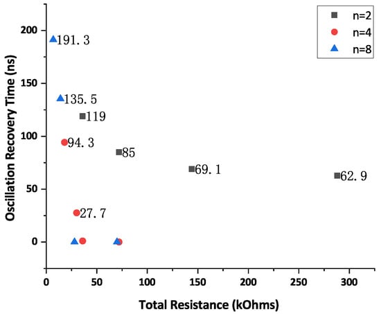 Figure 12 illustrates the relation between the total resistance in the SMPS structure for hardening and the VCO oscillating recovery time at different split factors. The VCO oscillating recovery time’s decreasing trend for (black square in the figure) clearly shows that it is unlikely to achieve SET immunity. When the total resistance reaches about 40 with and , VCO oscillating does not stop when SET occurs.