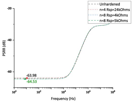 Figure 14 illustrates an LDO PSRR comparison between unhardened LDO and several SMPS LDOs with different configurations. SMPS structure does not affect the PSRR of the LDO.