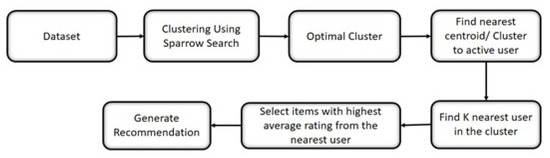The approach used in this work for generating recommendations is presented in Figure 1. The dataset is passed to the sparrow search algorithm for generating optimal clusters. For generating recommendations for the current user, the cluster with the nearest centroid is selected. In the selected cluster, the k-nearest neighbors are selected by using the kNN algorithm. The items rated by these k-nearest users are averaged, and the items with highest average ratings are suggested to thr active user.