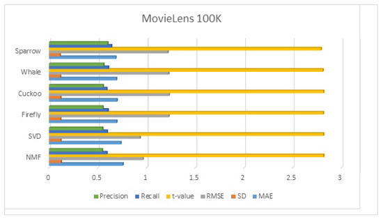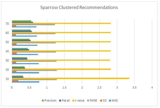 Table 4 and Figure 3 compare the MAE, SD, RMSE, t-value, recall, and precision values for hybrid sparrow-based clustered algorithms to the collaborative filtering technique (CF) to demonstrate the proposed algorithm’s performance based on different cluster size.