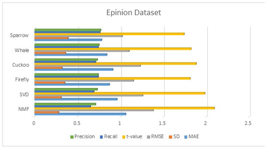 - Epinion—A total of 664,824 ratings of 139,738 items from 49,290 users constitutes the Epinion dataset. Open-source data composed from Epinion.com includes userid, itemid, and rating. A scale is set ranging from 1–5 for rating individual items. The performance of the proposed sparrow-based recommendation system is based on a different cluster size.