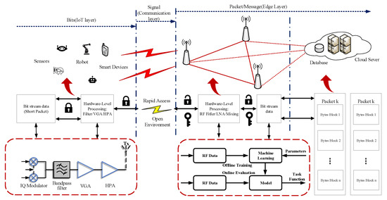 In this section, we introduce an RFI-aided URLLC architecture as shown in Figure 2, where a radio frequency identification model and URLLC system with massive MIMO are deployed to cooperatively serve large-scale smart devices [13]. Massive intelligent devices such as lightweight sensors, robots, and low-power communication devices transmit key information to distributed BSs through wireless channels. Then, received signals are processed by those BSs for high = level information extraction. Furthermore, valuable information is transferred to the cloud server for further computation, analysis, and decision making. Under classical URLLC scenarios, most of the information block is short packages that contain different transmission characteristics compared to typical Shannon capacity theory. We discuss those characteristics in the following section. All those radio frequency characteristics are created in the transmitter, and can be efficiently and completely detected at the receiver side. Once we obtain the device’s raw radio frequency signals, authentication processing can be carried out for the access legitimacy of the device.