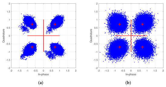 Constellation corresponding to two different real mobile devices’ SRS frame in the same environment. (a) Nonlinear characteristics of device1 in constellation. (b) Nonlinear characteristics of device2 in constellation.
