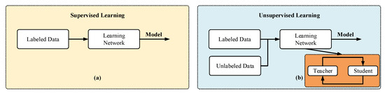 Supervised learning requires massive numbers of labeled training samples to guarantee the promised performance [30]. Semisupervised learning shown in Figure 5b, i.e., joint learning from labeled and unlabeled samples, is an active research topic due to its key role on relaxing human supervision. Despite the strong performance of pseudolabel methods, there is still a main drawback: if pseudolabels are inaccurate, the student network must learn from an inaccurate parameter [36]. The student network may not achieve significantly better performance than that of the pretrained teacher network, which is called confirmation bias. To solve the above problems, the authors systematically designed a solution framework to reduce false label learning bias [34]. In this framework, we designed such a mechanism where the teacher network could obtain information from student predictions, which is used to further correct soft label decisions for unlabeled data. To elaborate the mutual learning process between the two networks, we rewrote the cross-entropy loss function on the basis of the student network: