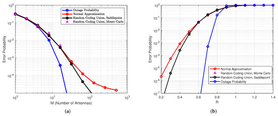 As shown in Figure 9a, theoretical outage probability and approximation methods were compared. We assumed that they all had the same received SNR. Results demonstrate that the saddle-point approximation matched well with Monte Carlo testing. With the increase in number of antennas M, there was a gradual differencein those methods due to the estimation error except saddle-point approximation. Figure 9b shows the relationship between R and error probability. Specifically, a fixed number of antennas is considered. Only the saddle-point method was an exact actual random coding union (RCU) bound. In summary, outage probability and normal approximation do not always provide good estimations of the error probability achievable in URLLCs with massive MIMO over quasistatic channels.