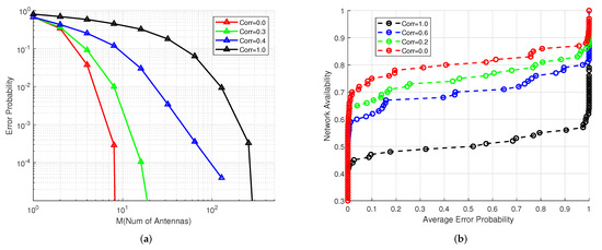 In order to validate the asymptotic analysis of channel correlation, we numerically evaluated the uplink transmission error probability when two devices transmit at the same power and pilot sequence. Furthermore, we assumed that the devices were located at , and their channel correlation could be designed for evaluating the significant impact on error probability. As shown in Figure 11a, average error probability as a function of M with different levels of channel correlation is investigated. These results demonstrate that channel correlation can directly influence system error probability. However, with the increase in M, system performance can be greatly improved due to the promotion of spatial freedom.