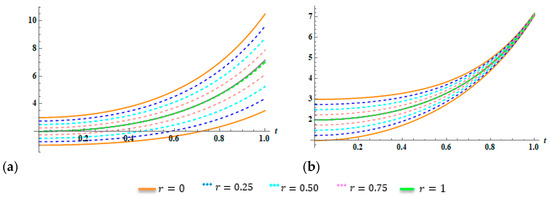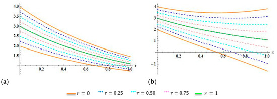 (a) Fuzzy approximated solutions , case 1. (b) Fuzzy approximated solutions , case 2, for Example 2, in parametric form, when .