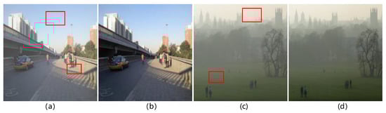 The task of image dehazing is limited by several constraints: (1) depth map, atmospheric light intensity, and light wavelength, and (2) lack of labeled training data. Limited by the above conditions, researchers have proposed some prior methods, such as dark channel prior [6], color-line prior [7], and nonlocal color prior [8], but irregular lighting or white areas would violate these priors. To make up for the shortcomings of the prior methods, researchers use CNN methods to obtain dehazing output. They either obtain the transmission map [9] or directly calculate the dehazing results [10,11,12,13]. Although these methods have achieved excellent performance, they are supervised networks and need numerous labeled data for training (such as the NYU Depth dataset [14] and RESIDE [15]), ignoring the role of real data in the training process. In addition, the artificial dataset contains little background and scene depth, which makes the distribution inconsistent between the artificial and the real images. Thus, algorithms based on deep learning are usually limited to synthetic training datasets and cannot be well generalized to real-world hazy images. For example, as presented in Figure 1, the atmospheric light of the synthetic data in Figure 1a is obviously greater than that of Figure 1c in red rectangles, while Figure 1b,d prove that the model trained on the artificial data does not perform well on the actual images. Another important thing is that the above CNNs either constrain latent space in middle layers [16] or introduce designed losses in the output end [10,11,12,13] to limit predicted results; they do not take both into account simultaneously.