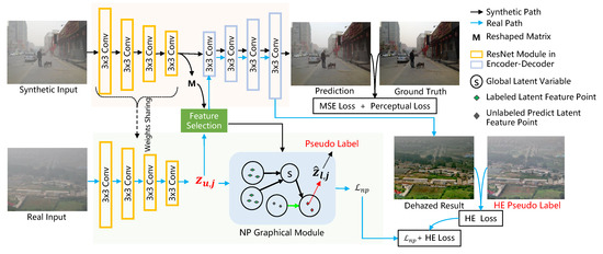Like GP, NP [40,41] is also considered from the function space, and NP combines the advantages of the GP and neural networks. Our idea is to map the predicted value to the latent space of the labeled data with NP, and then generate the pseudo latent feature label (PLFL). After using NP for the aforementioned extracted feature matrix M and , the PLFL is already in the latent space of synthetic hazy data, then reducing the distance between the unlabeled data predicted value (the encoder output of unlabeled data) and the PLFL could reduce the difference between the two domains.