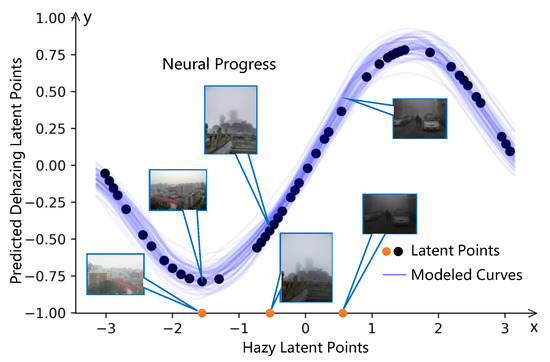 One example of NP dehazing procedure. The latent points in the figure and hazy images are in one to one correspondence and hazy data are data points in high-dimension space. Using NP to fit the curves based on the observed latent feature points in latent space, we could fit countless curves like GP. The NR encodes sampled feature points from output of the encoder H as intermediate features and establishes a multivariate normal distribution using one invariant representation. The newly unlabeled latent feature is combined with sampled feature points from one normal distribution and then we input them into one decoder to output the infinite predicted values.