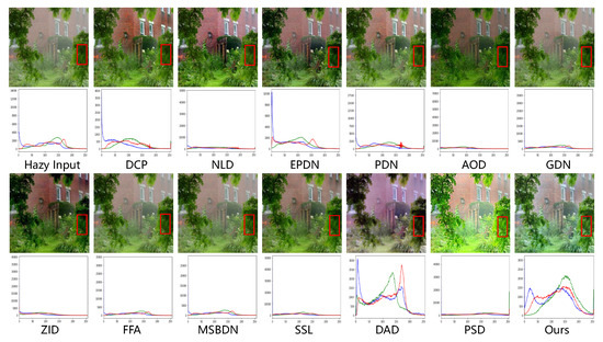 Figure 6, Figure 7, Figure 8 and Figure 9 present the subjective experimental results of the proposed method and other methods for Fattal’s data and the RTTS dataset, respectively. All supervised haze removal methods, including FFA and MSBDN, perform well on synthetic data but they are not satisfactory on real data. The supervised dehazing results have haze residue and are even ineffective, such as FFA and MSBDN failing with real data dehazing, which again proves a domain gap between the synthesized and the real image. The results of ZID are more dim than raw input. In the domain adaptation methods, the SSL dehazing result appears dark for foreground and background. The results of DAD show color variations in content and chaos at the edges. The result of PSD is too bright, and the saturation is too high, making it uncomfortable to look at for a long time. Thus, the PSD method did not find a domain invariant space combined with results in Figure 5, Figure 6, Figure 7 and Figure 8. Combined with Figure 8, the dehazing results of DAD are more in line with subjective perception than SSL and PSD on RTTS. Combined with the pixel statistics graph in Figure 6, DAD and our dehazing results are similar to pixel statistics, but our results are smoother. The SSL and DAD in Figure 8 are too dim, and results of SSL show more residual haze. The PSD shows the same problem in Figure 6. Figure 7 and Figure 9 present more dehazing results including Fattal and RTTS, respectively. Our results are consistent with human subjective perception. Our results do not have the above problems, and our results generally achieve a nice dehazing effect, which shows that the proposed method has found a better domain invariant space.