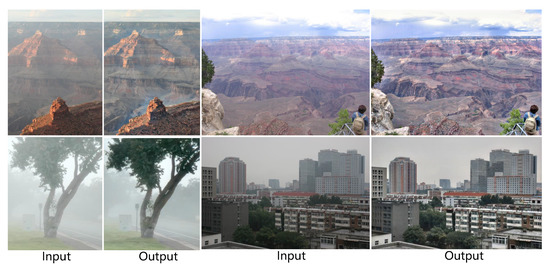Owing to the limitation of the prior methods, learning-based techniques have been widely used to solve the dehazing problem. Zhu et al. [22] found that the color decayed with scene depth. They proposed a color decay prior, and further constructed a linear regression model of scene depth, and obtained the dehazing results through a supervised regression method. Unlike [22], more convolutional neural network (CNN) techniques have been developed. Cai et al. [9] firstly proposed an end-to-end transmission estimation CNN. Similarly, in [23], Ren et al. established a multiscale CNN (MSCNN) to remove haze by mapping the relationship between hazy images and transmission. Furthermore, [13] introduced a densely connected network with a discriminator to acquire a transmission map and atmospheric light simultaneously. The discriminator is used to ensure that the transmission map is strongly related to the dehazing results. The above methods still obtain the transmission image first, and then obtain the dehazing images based on the atmospheric light scattering model. The authors of [12,24,25,26] put forward the end-to-end dehazing methods. In [27], Pang et al. designed HRGAN including a discriminator network and a generator network to achieve haze removal. Qin et al. [12] introduced attention mechanisms to channel and pixel, respectively. Dong et al. [24] established a multiscale enhanced defogging network (MSBDN) using a complex U-Net-like structure. Scholars have developed unsupervised solutions based on the atmospheric scattering model. Pan et al. [28] believed that the image restoration results should be consistent with the observed input under specific physical models, so they proposed to use the physical model to guide the specific task in the GAN framework. To better process the actual hazy images and avoid domain shift, Golts et al. [29] abandoned artificial data, such as the RESIDE dataset. They introduced completely unsupervised dehazing architecture with dark channel prior loss. Li et al. [25] regarded one hazy image as the coupling of a dehazing layer, transmission layer, and atmospheric light layer. To restore binocular hazy images, Pang et al. [30] developed a binocular image dehazing network (BidNet), which could survey the relation between binocular image pairs to improve the dehazing quality. Wu et al. [31] introduced the contrastive strategy into a CNN and employed an adaptive mixup and dynamic feature module, and they acquired very competitive performance. Furthermore, Zhang et al. [32] targeted video dehazing. They first provided a video hazy dataset and explored the temporal information with a confidential and improved network.
