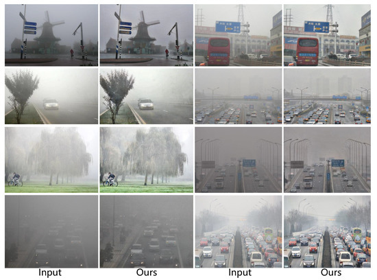 The proposed method results on RTTS dataset. It can be seen that our method removes the haze without oversaturation and color confusion, and the dehazing results are comfortable.