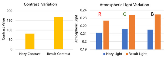 The image contrast and atmospheric light change before and after image dehazing; it can be seen that the proposed method enhances the contrast and brightness of the image and avoids the darker dehazing result.