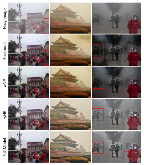 Gradually increasing different modules on backbone, and output of related results. The dehazing results comparison of backbone with different modules. Red boxes are highlighted for a better visualization comparison. The best subjective perception could be found in our proposed method.