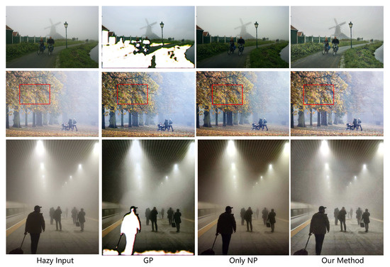 The GP, NP, and our full model dehazing results on RTTS dataset. The dehazing results of GP have serious problems, some areas in its results turn white and lose information, which is not present in our results.