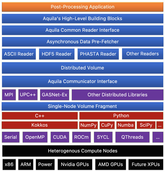 The fourth design principle is related to many file formats and their constant evolution. As with hardware heterogeneity (or, some would affirm, even more critical), the amount of file formats available to application developers is far too large even to keep up. Furthermore, many software packages, libraries, and scientific domains have vastly differing IO backends, making choosing an IO format as necessary as the language in which an application is programmed. The proposed methodology provides a modular interface for IO for distributed memory communication to address this fact. Depending on the need, any given file format can be supported if it implements a Writer or Reader, which is a customization point between Aquila and any other file format. For instance, data stored in a NetCDF file can be read by an application writing to HDF5 or vice versa. This format-resiliency to IO requirements enables flexible interfaces sharing a common, high-performance computational core. These components are presented in a simplified schematic in Figure 1 (taken from [22]; reprinted by permission of the American Institute of Aeronautics and Astronautics, Inc.).
