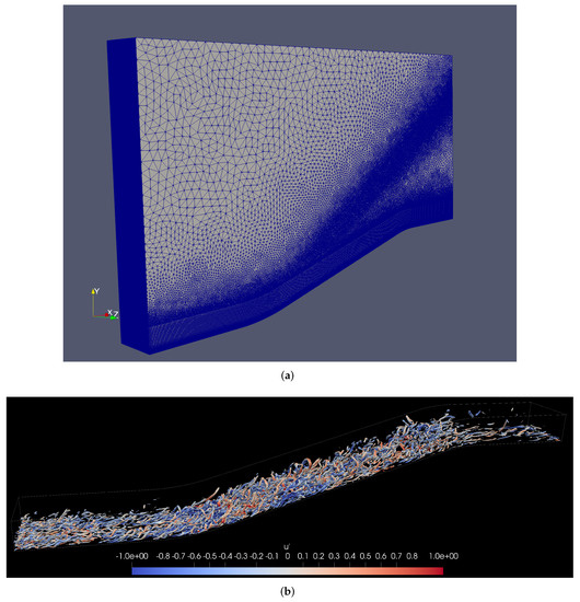 • The dataset employed in Stampede2 consists of 792 flow fields of the supersonic concave-convex DNS [45]. The hybrid unstructured mesh consists of approximately 9.9 M cells and 8.5 M points, as seen in Figure 3a. Note the inclined source region of pyramid elements (five faces) to capture better the compression waves generated by the concave-curved wall. This inclination angle (≈35 ) was obtained by previously performing a 2D RANS analysis in concave walls [46]. The turbulent inflow conditions were prescribed based on a Zero-Pressure Gradient (ZPG) case, or turbulence precursor [47], Ref. [48] via DNS. The uncompressed size of the dataset is approximately 150 GB using double precision and stored in HDF5. The mesh contains roughly 5 M nodes (565 × 80 × 105 along the streamwise, wall-normal, and spanwise direction, respectively) just in the structured part with hexahedra. We visualize regions where Q > 0 colored by the instantaneous streamwise velocity fluctuations, u , normalized by the freestream velocity in Figure 3b based on the Q-criterion. The rotational nature of the flow is enhanced due to the concave wall’s adverse pressure gradient. Further, more complex structures such as hairpin-like vortices can be seen throughout the ramp. In general, the legs of hairpin vortices show negative values of u , whereas the hairpin vortex’s heads exhibit positive values of velocity fluctuations. Again, we stored pressure, temperature, and velocity components for each node. The lower storage footprint for the Stampede2 benchmark is due to the available node hours.